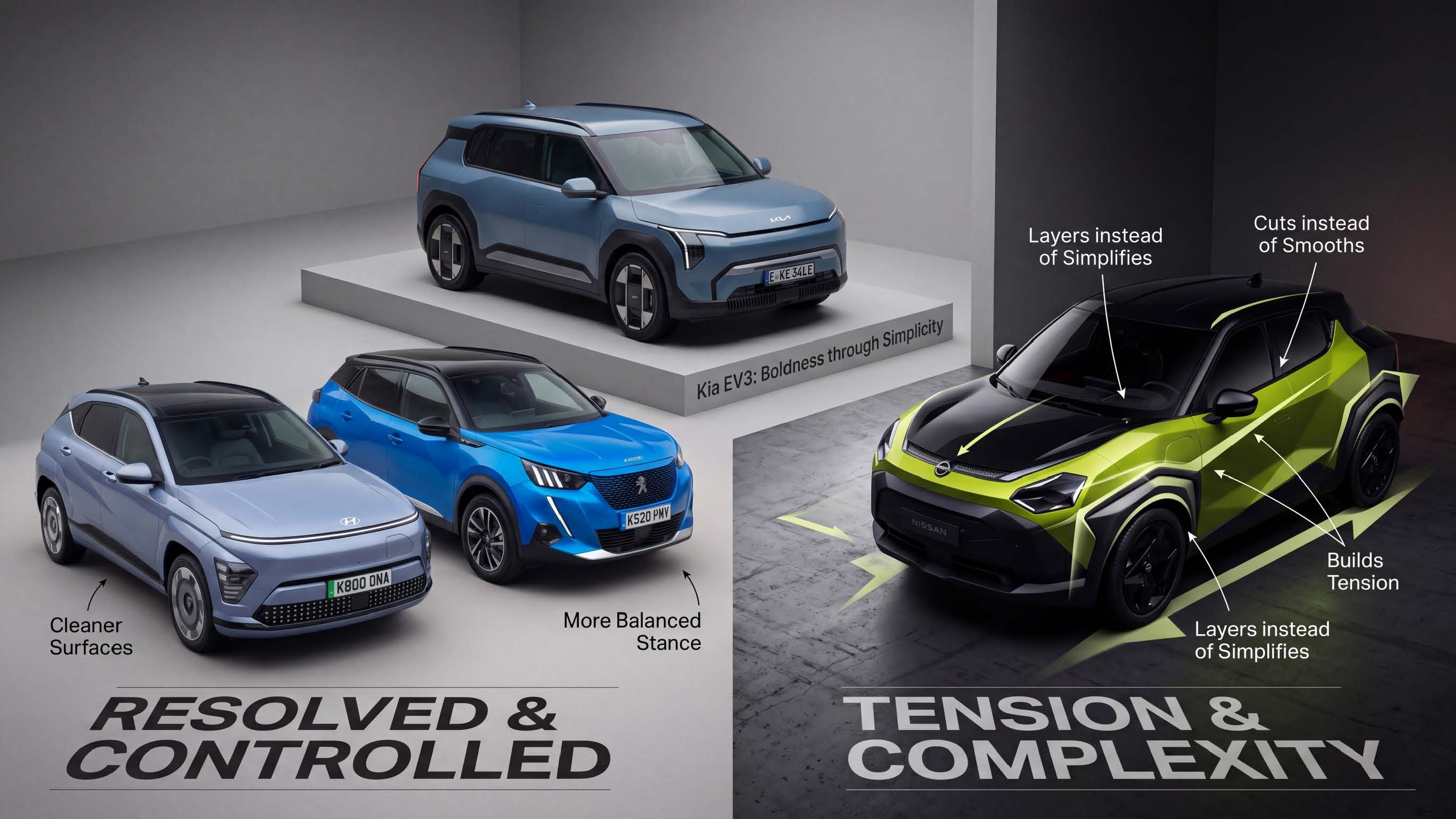 We all know that the compact EV crossover space is getting crowded, but visually, you can almost predict. Cars like the Hyundai Kona Electric and Peugeot e-2008 feel resolved. Their surfaces are cleaner, graphics are more controlled, and the stance is much more balanced. Then there’s the Kia EV3, which explores boldness through simplicity rather than complexity, but the Juke takes the opposite route. It layers instead of simplifying. It cuts instead of smoothing. It builds tension instead of resolving it.