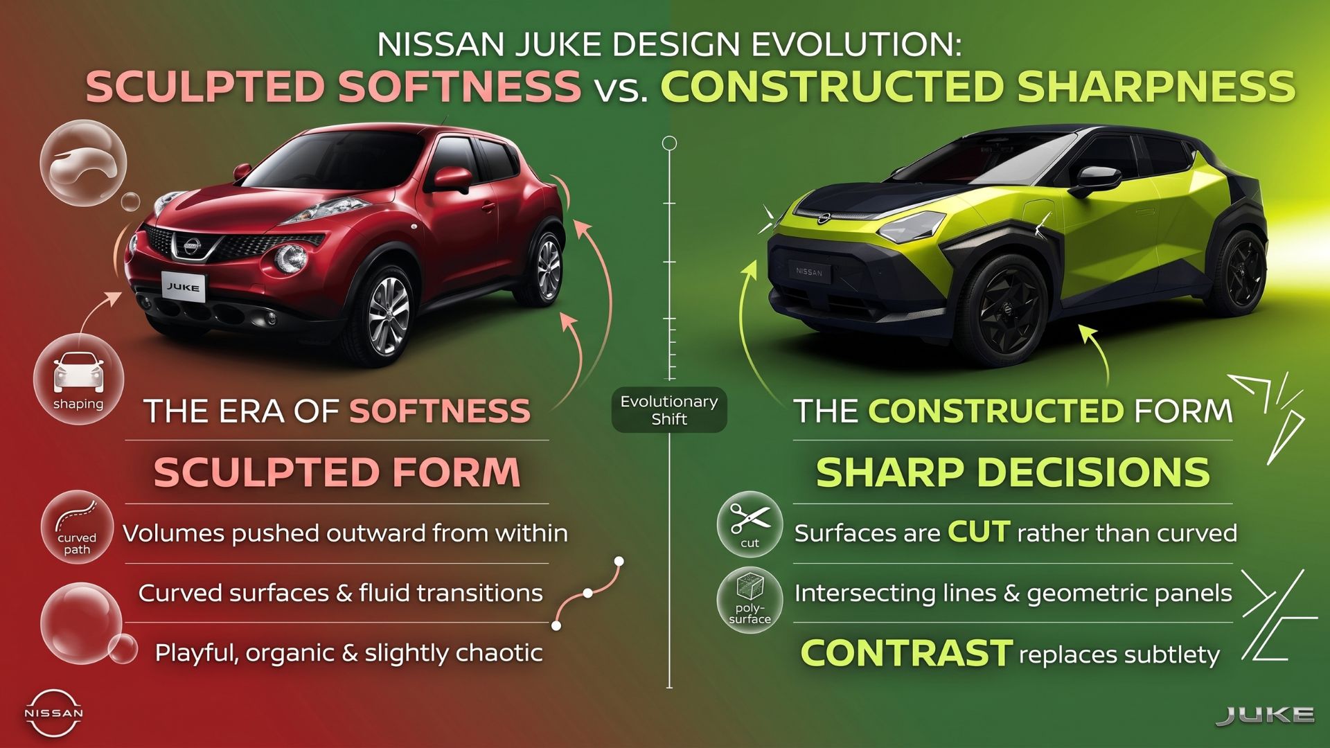 What’s happening here doesn’t feel isolated. It feels like direction. We all know that Nissan has explored expressive forms before, from the exaggerated early Juke to the smoother surfaces of the Nissan Ariya. But this new Juke replaces fluidity with structure. Edges are sharper. Transitions are tighter. Contrast is doing more work than form. This suggests a shift toward a more graphic, almost digital design language where precision defines identity.